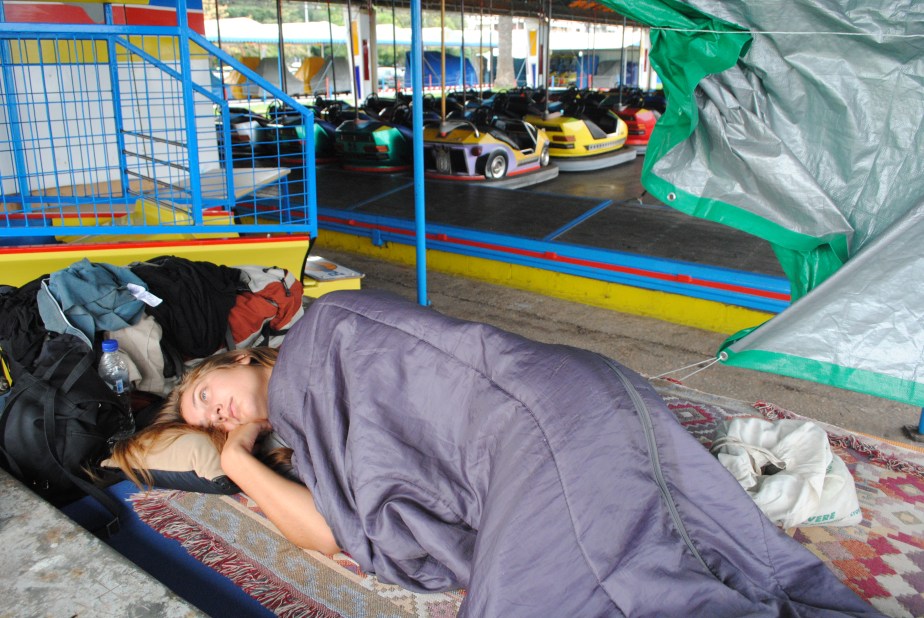 I spent some days travelling Greece with two Marias, a German and a Romanian. Here was a lesson in how to sleep on a metal bench in an Amusement Park. Yes, we did get busted at 5am by a very nice man who allowed us to pack up slowly before he opened the rides. In the other photo you can see me attempting to sleep on a rocky beach front with a very small cat. This also rates as one of my best hitchhiking missions. (My next post is likely to be How to Hitchhike with Kittens.)