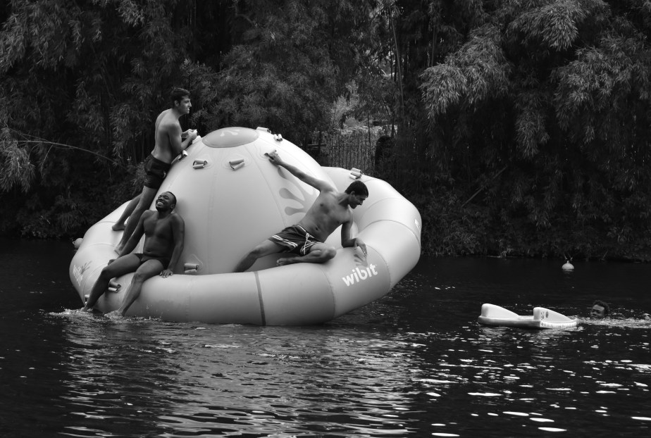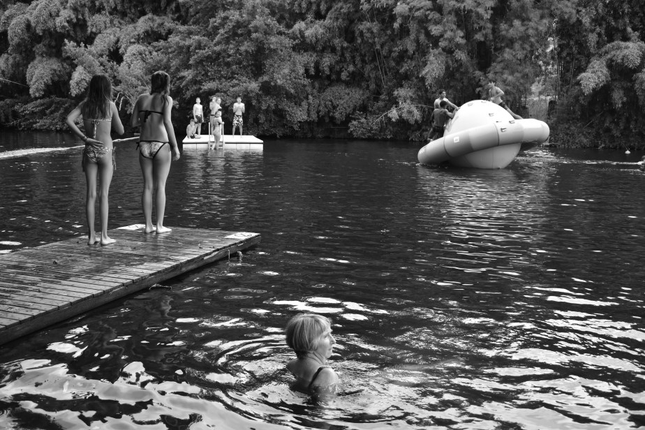 It’s another hot day at Laguépie in the south of France and everyone is hanging out at the river. The lifeguard has a steady gaze. There’s screams, splashing and laughter as this crazy, inflatable spaceship rock and rolls.
